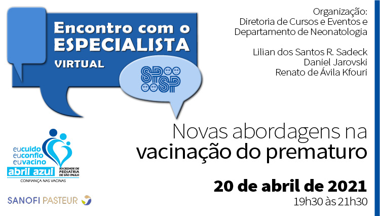 | 19h30 – 21h30 | Novas abordagens na vacinação do prematuro Coordenação e Moderação: Dra. Lilian dos Santos Rodrigues Sadeck |